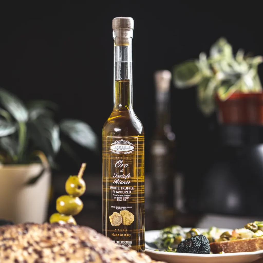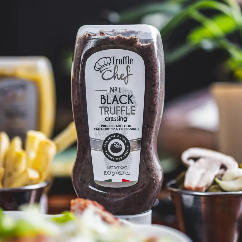 Luxurious drizzle of Black truffle EVO oil with flakes
