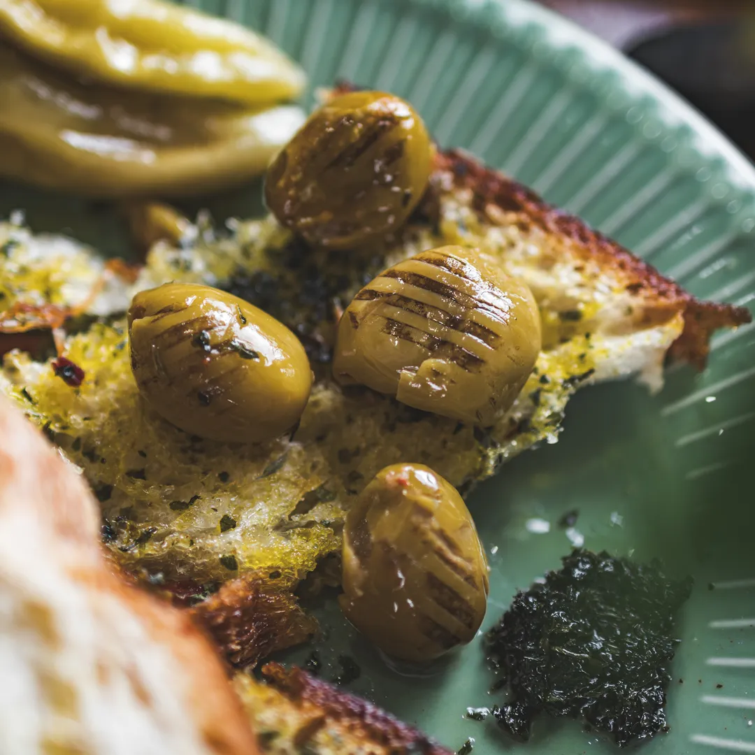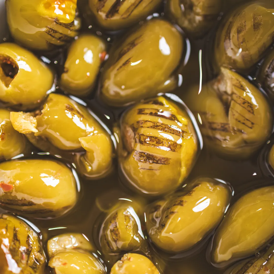 Chargrilled olives are olives (often pitted) quickly grilled over high heat to develop smoky, charred notes and a warm, savory flavor, enhancing their natural richness and creating unique texture through grill marks, then typically marinated with herbs, garlic, olive oil, and vinegar for a gourmet Mediterranean appetizer or addition to salads, tapas, and charcuterie boards.