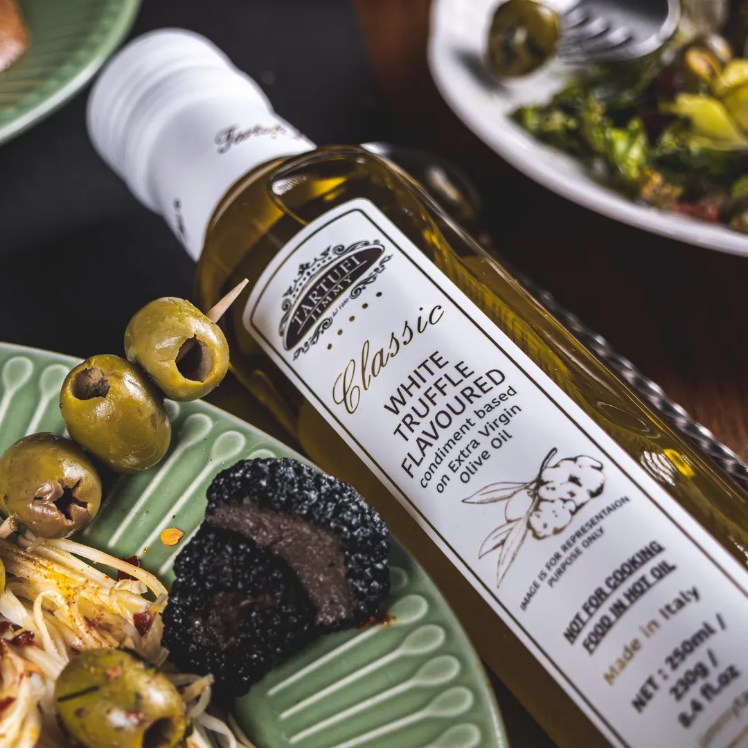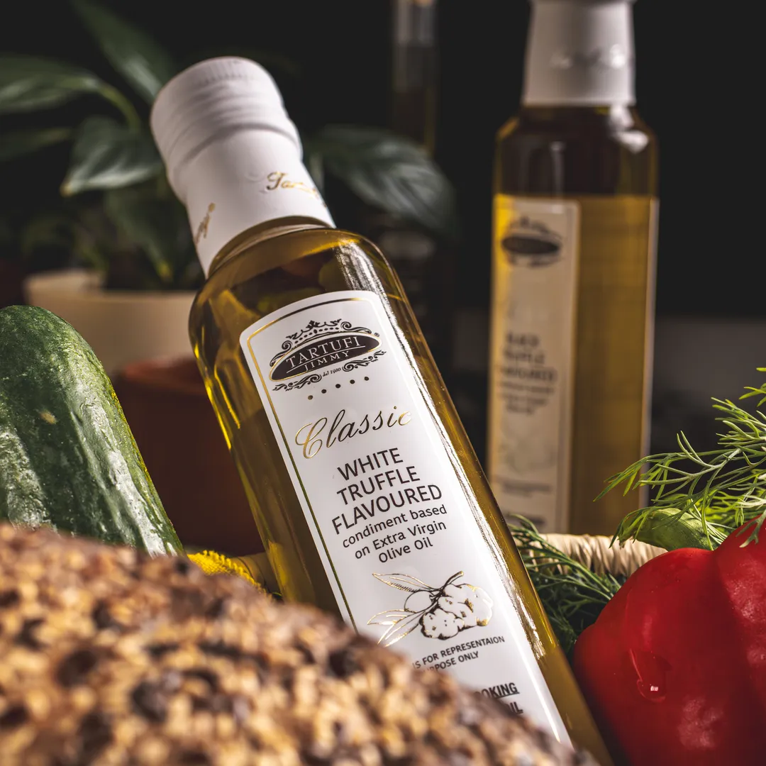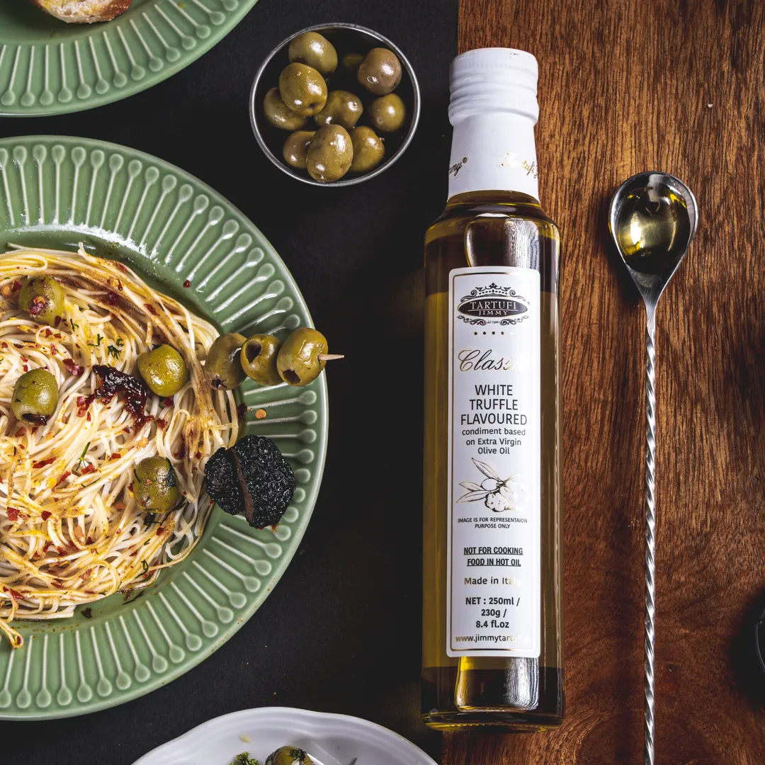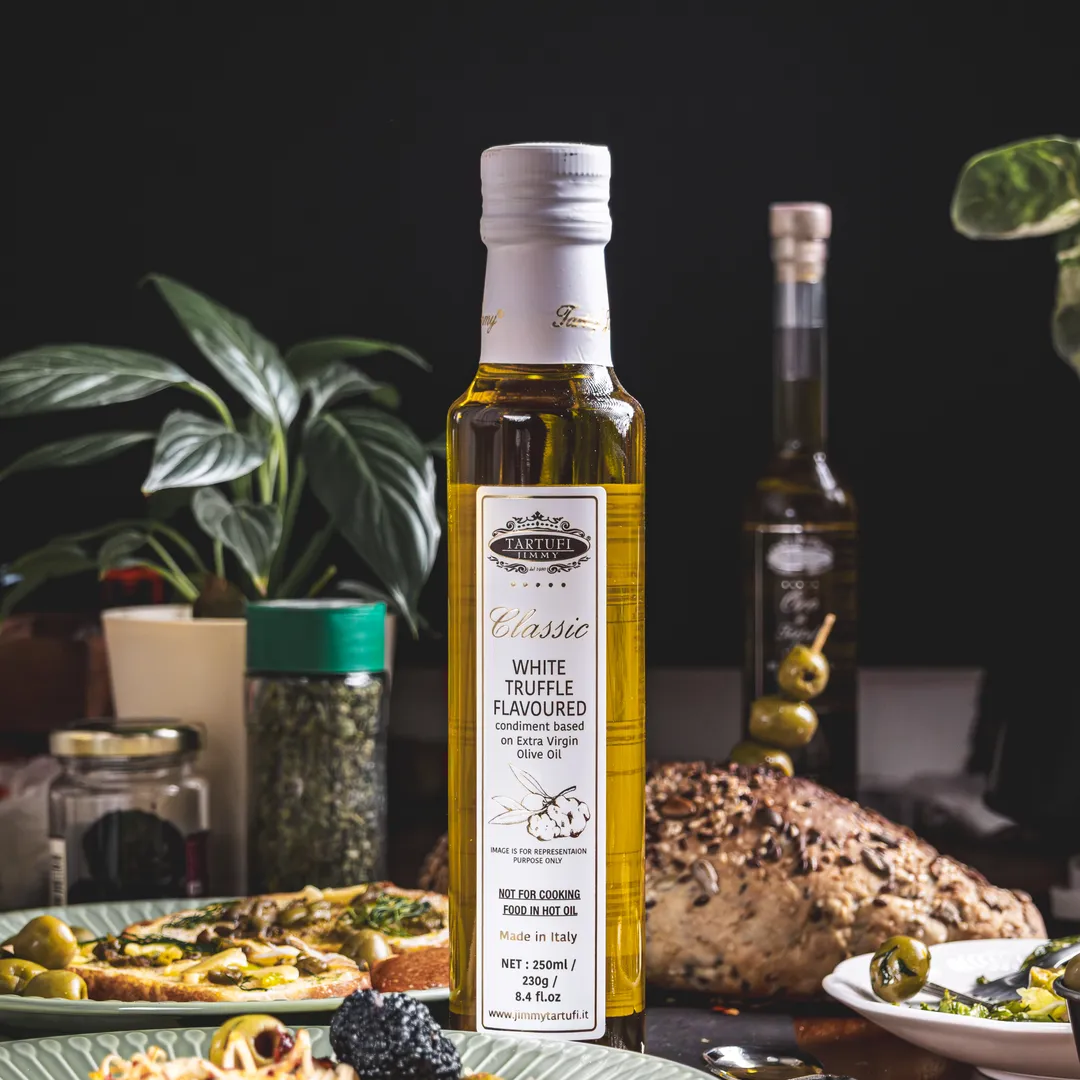 An oil that tells its story, crafted according to ancient traditions with hand-picked olives and cold-pressed. The dried truffle flakes, obtained from fresh, fragrant truffles from our wonderful region, come to life in this precious extra virgin olive oil, giving the product a delicate, fragrant flavour. Jimmy Tartufi WHITE TRUFFLE OIL is a premium, luxurious and velvety gourmet olive oil infused with the flavour of white truffles and packaged in Italy. It is a versatile condiment recommended for drizzling over dishes to add a luxurious, earthy taste, and it is typically made with high-quality extra virgin olive oil (EVO).