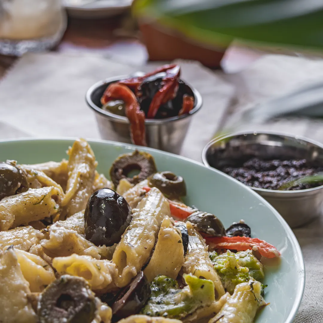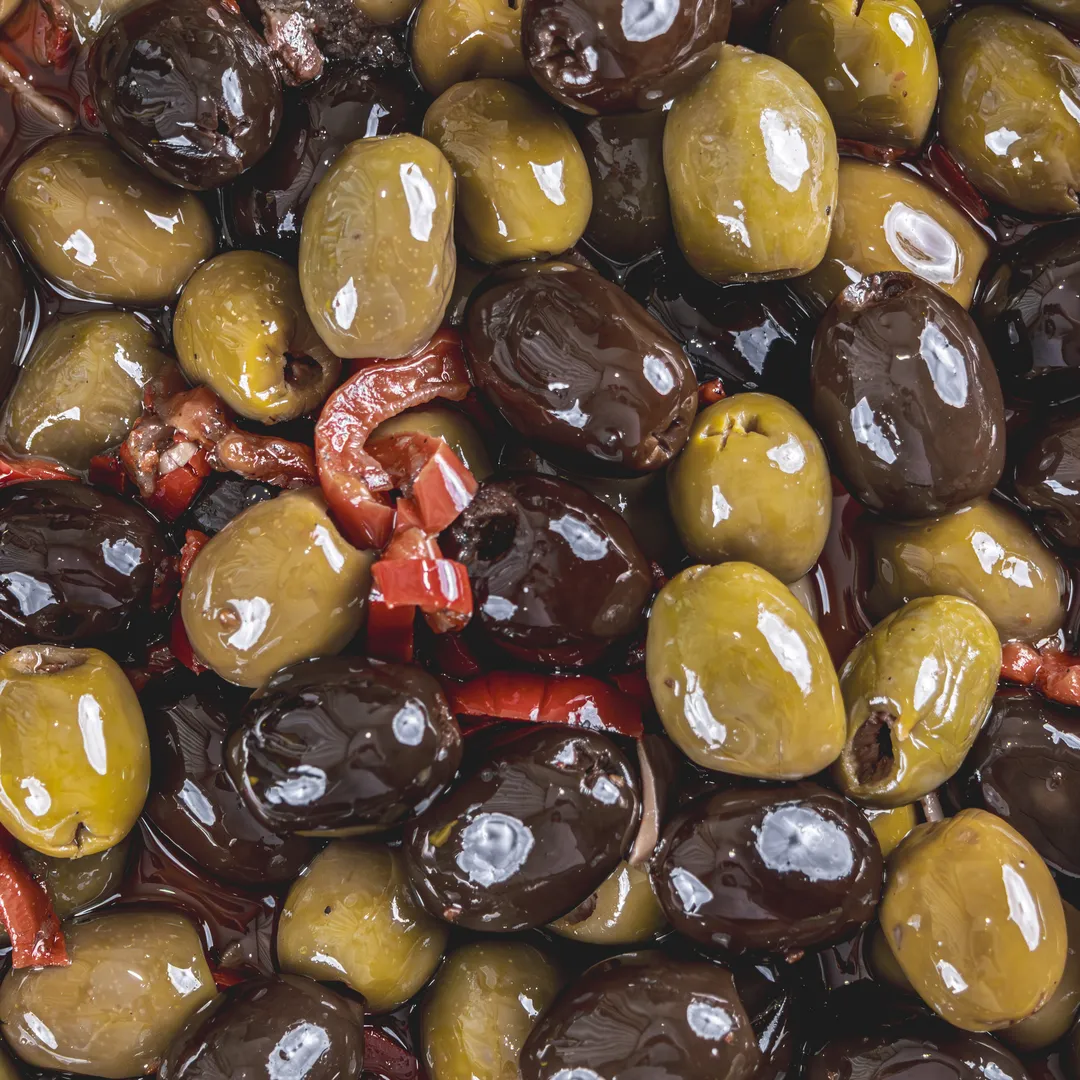 • Mixed Olives: A blend of green olives (picked early, firmer, slightly bitter) and black olives (ripened longer, softer, richer flavor).