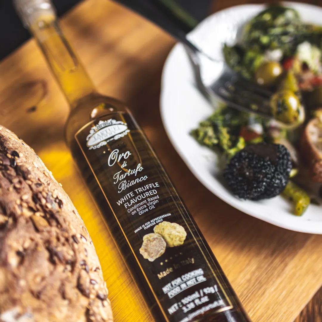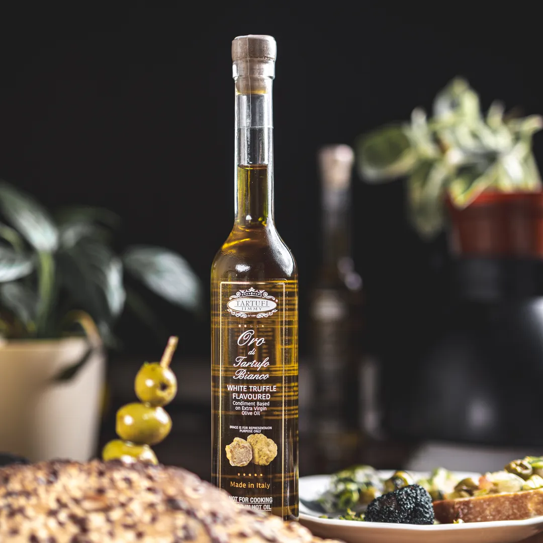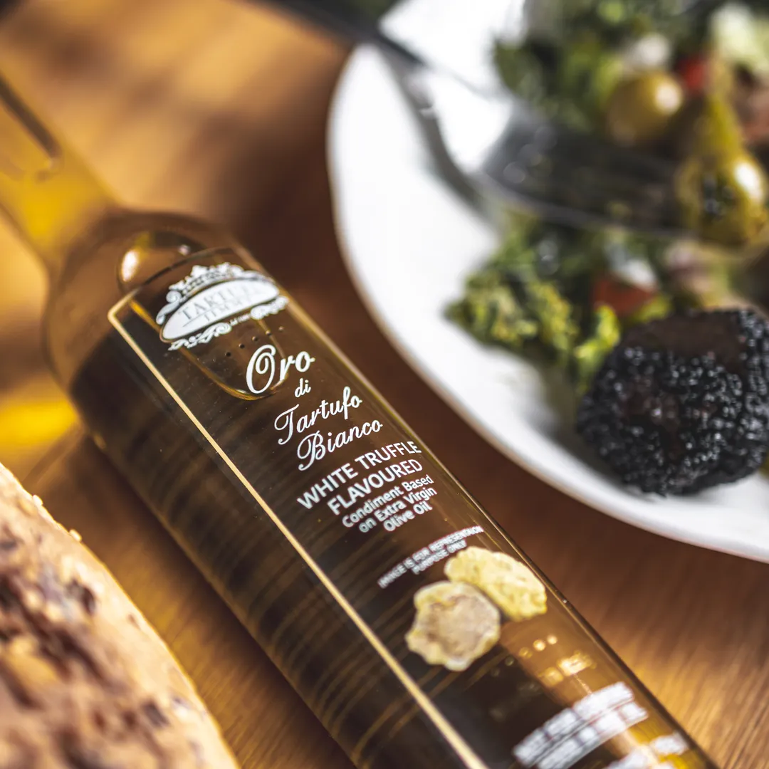 An oil that tells its story, crafted according to ancient traditions with hand-picked olives and cold-pressed. The dried truffle flakes, obtained from fresh, fragrant truffles from our wonderful region, come to life in this precious extra virgin olive oil, giving the product a delicate, fragrant flavour. Jimmy Tartufi WHITE TRUFFLE GOLD WITH EVO OIL is a premium, luxurious and velvety gourmet olive oil infused with the flavour of white truffles and with variety of white truffle flakes and packaged in Italy. It is a versatile condiment recommended for drizzling over dishes to add a luxurious, earthy taste, and it is typically made with high-quality extra virgin olive oil (EVO). It is available in a 100ml size and is suitable for a range of foods.