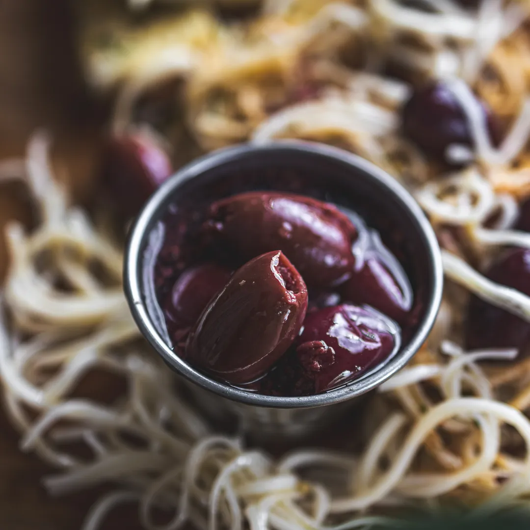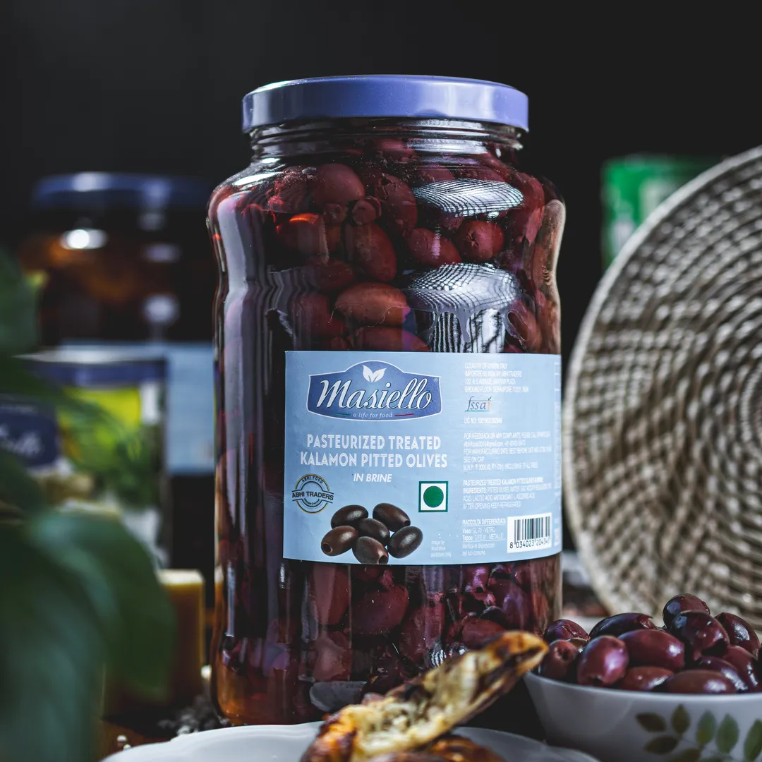 Pitted Kalamata olives in brine are ready-to-eat, rich, briny olives (often from Kalamon) cured with salt, water, vinegar, and olive oil, making them perfect for salads, pizzas, pastas, or tapenades, offering a healthy snack with antioxidants and healthy fats.