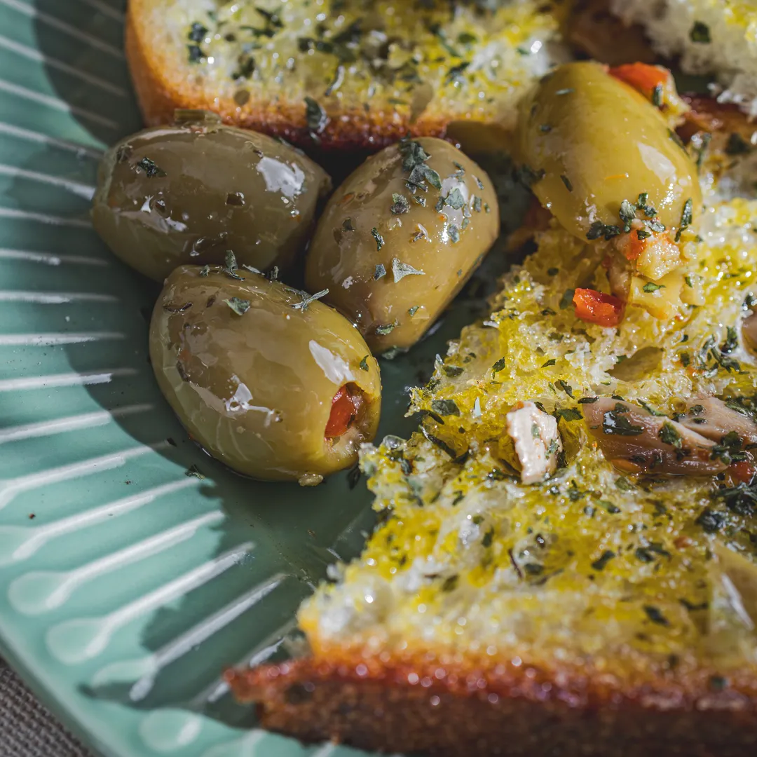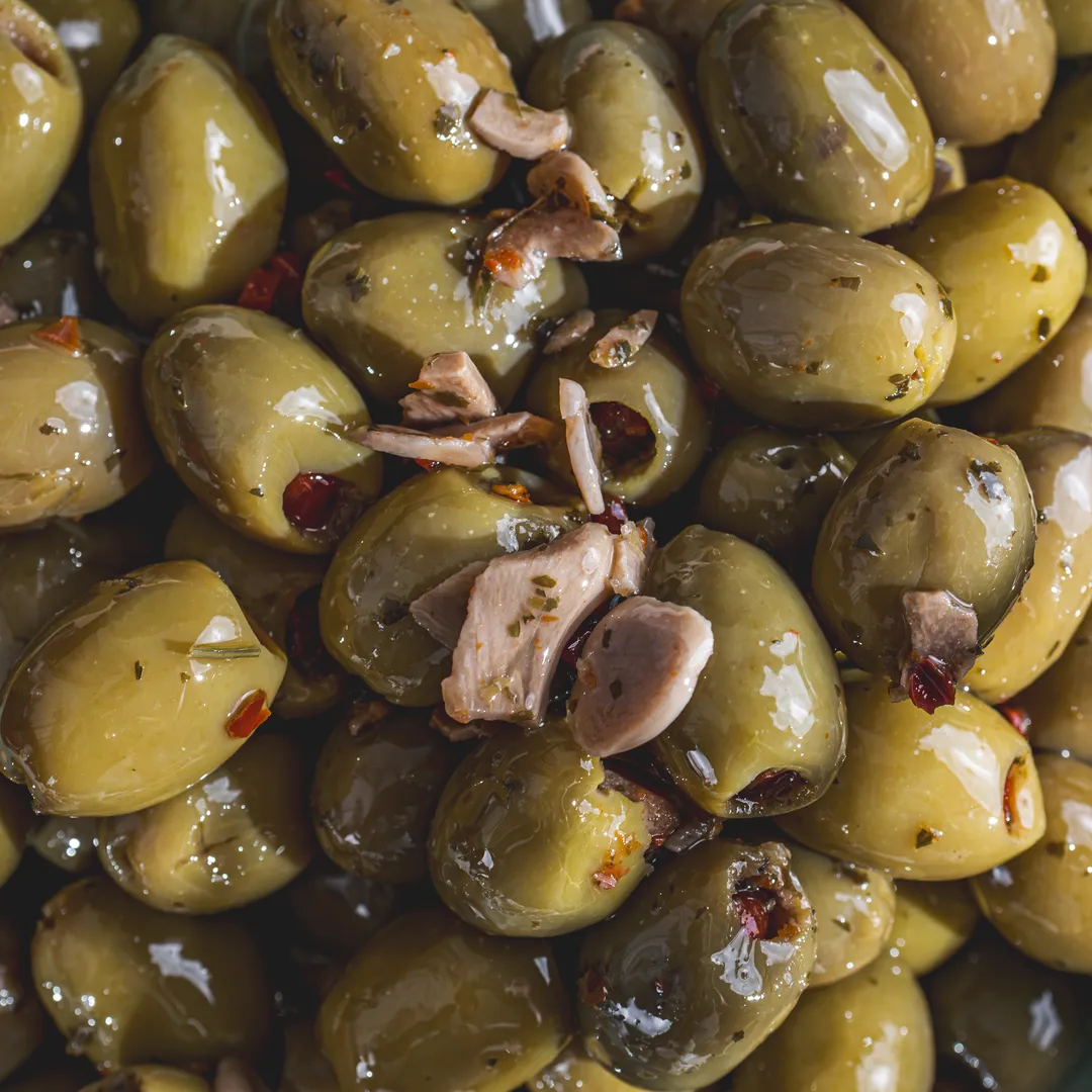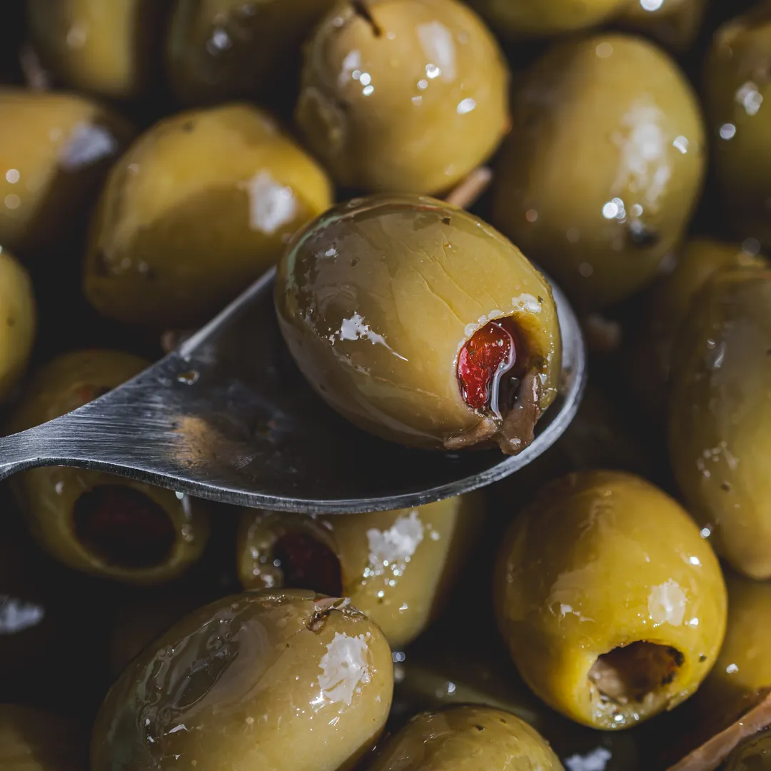 Olives stuffed with Pimento paste in oil, especially in a 1.9 kg size, are a popular Mediterranean antipasto, commonly using large green olives filled with red pimiento pepper paste. These typically consist of large, firm green olives that have been pitted. The hollow centre is filled with a bright pimiento pepper paste, creating a striking colour contrast. These large-format jars offer a tangy, spicy, and Savory snack perfect for salads, cocktails, or charcuterie boards, and can be found from importers and specialty food sites.