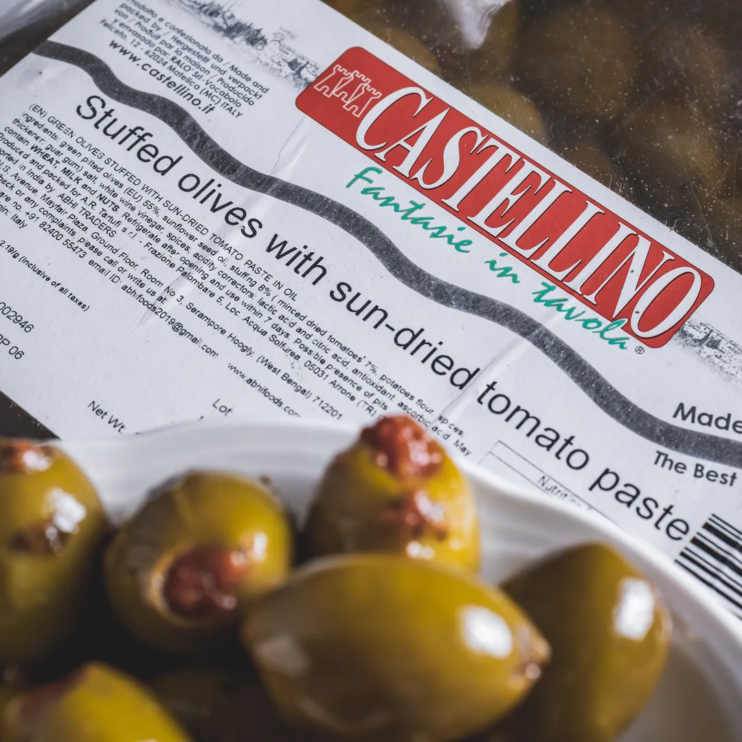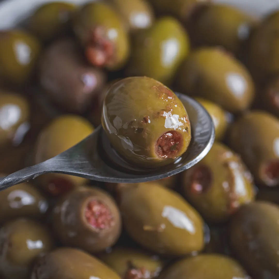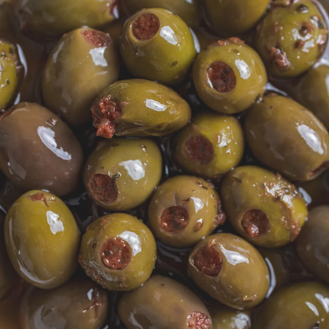 Olives stuffed with sun-dried tomato paste in oil are a flavourful Mediterranean delicacy, featuring tangy green olives filled with a Savory blend of oil-packed sun-dried tomatoes, garlic, herbs (like basil, oregano), often blended into a paste, making for excellent appetizers, tapas, or additions to salads, sandwiches, and antipasto platters, offering a taste of sunshine in every bite. This combination balances the salty, briny tang of the olive with the deep, sweet, and slightly smoky intensity of slow-dried tomatoes.