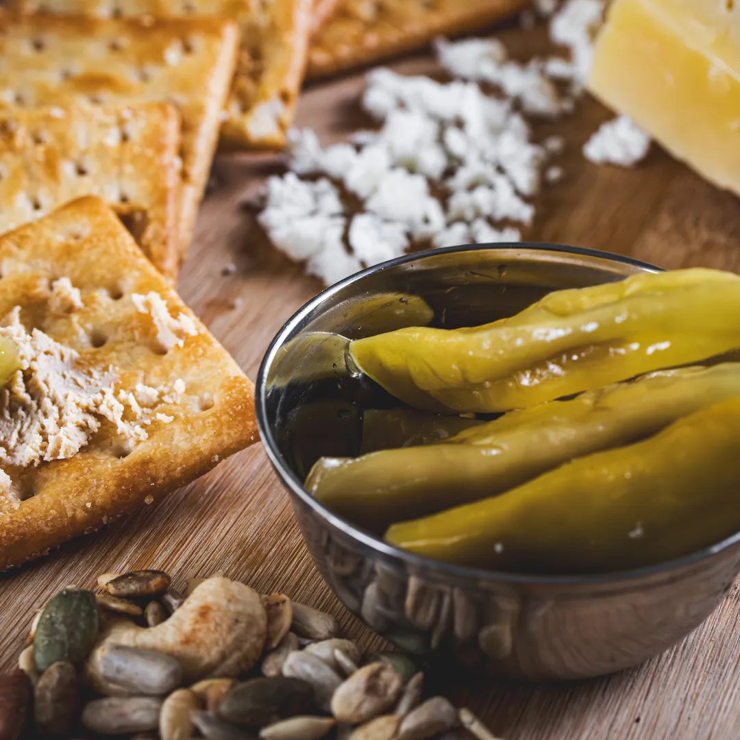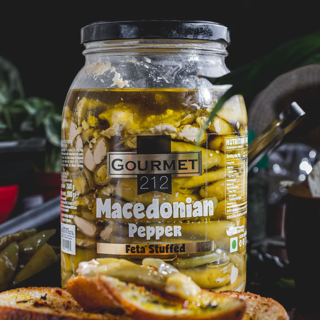 Macedonian Peppers, known for their vibrant color, a double-cream cheese, tangy pickled flavor, and moderate heat, available stuffed with cheese (feta), perfect for Mediterranean-style appetizers, salads, pizzas, or with grilled meats, boasting certifications like Halal, Kosher, and Organic. These Mediterranean stuffed Macedonian peppers are delicately filled with a rich blend of creamy feta cheese and smooth cream cheese, creating a perfect balance of flavors. The peppers are preserved in high-quality olive oil, offering a premium snack or appetizer that’s both indulgent and nutritious